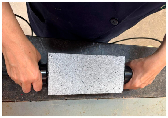 The dynamic modulus of elasticity was determined using the Ultrasonic Pulse Velocity (UPV) test, which employed a device operating in pulse-echo mode (Pundit Lab, 200 kHz frequency, Ø 20 mm transducers). To ensure proper contact and minimize signal loss during wave transmission, the transducers were coupled to the surface of the specimens using medical-grade ultrasonic gel. After applying the gel, the transducers were positioned on opposite faces of the specimen, aligned and parallel to each other, ensuring a straight-line propagation of the ultrasonic pulse (Figure 9). The measurement of the wave’s time of flight across the material allowed the calculation of the ultrasonic wave velocity. Based on this data and the physical properties of the concrete (density and Poisson’s ratio), the dynamic modulus of elasticity was estimated using linear elasticity equations, in accordance with ABNT NBR 8802:2019 and ASTM C597 standards [31,32].