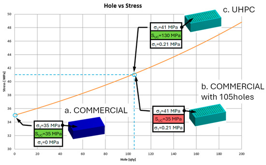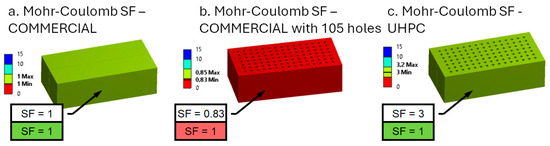 Figure 11 presents the Mohr-Coulomb safety factors for three specimen types: COMMERCIAL without holes, COMMERCIAL with holes, and UHPC with holes. Consequently, the candidate replacement material must exhibit a minimum compressive resistance of 41 MPa. In this context, ultra-high-performance concrete (UHPC) presents a viable solution for optimizing permeable blocks, ensuring structural integrity while maintaining the necessary drainage capacity.