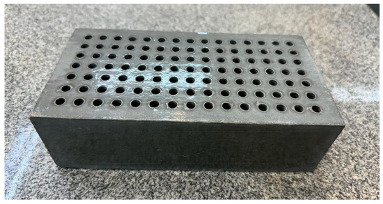 Adding fluid flow channels increases stress levels, which depend on the material properties, load conditions, and the block design. Therefore, it is necessary to use a material with higher compressive strength. The manufacturing constraints were considered, and the maximum number of fluid flow channels (each with a 6 mm diameter) was added. Then, a static FEA analysis was performed to verify the maximum stress under load, and based on these results, the minimum required strength of the replacement material was determined.