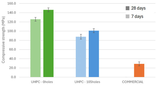 Compressive strength results for the three block types: UHPC-0holes, UHPC-105holes, and COMMERCIAL.