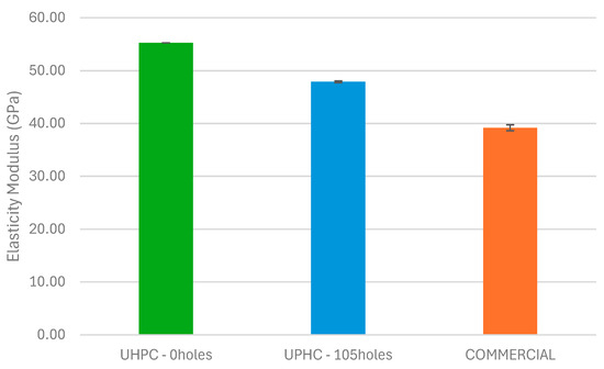 The results demonstrated that both UHPC blocks, 0holes and 105 holes, exhibited superior stiffness compared to the commercial concrete block. The UHPC-0holes blocks reached an average modulus of 48 GPa, while the UHPC-105holes blocks showed 45 GPa, against 32 GPa for the COMMERCIAL. These values represent an increase of 28.9% to 33.3% over the commercial alternative. The presence of 105 perforations led to only a 6.25% reduction in modulus, confirming the structural efficiency of the duct geometry and its minimal impact on ultrasonic wave propagation. Compared to the literature, some authors [36] reported values ranging from 22 to 24 GPa for porous concretes, while others [37] observed values between 40.5 and 46.7 GPa in conventional concretes cured up to 56 days. Moreover, the literature [4] emphasized the influence of air content on UPV measurements, noting that even a 6% air content could reduce wave velocity by up to 10%.