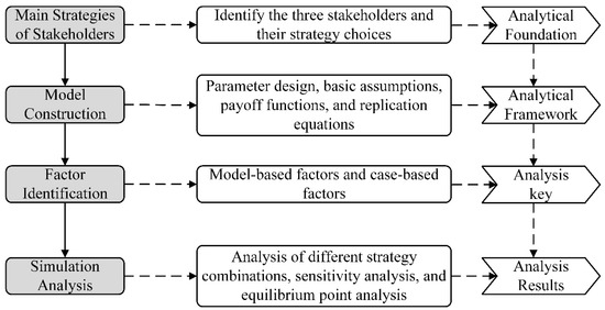 To systematically present the logical structure and modeling process of this study, Figure 1 illustrates the flow of model construction and analysis. The study is divided into four stages, forming a closed-loop research framework: “identification—modeling—analysis—verification.” The first stage involves identifying the subject strategies, in which the three key actors—government, enterprises, and villagers—are defined, along with their respective strategy combinations, using case study and interview data to establish the foundation for model development [29]. The second stage is model construction, which includes clarifying the strategy space, setting relevant parameters, constructing the benefit function, and deriving dynamic equations to form the computational framework for game-theoretic analysis [30]. The third stage is factor identification, in which sensitivity analysis of the core model variables with respect to actual data is conducted to identify key factors affecting the effectiveness of ecological governance [31]. The fourth stage is simulation analysis, involving equilibrium point analysis, scenario simulations, and sensitivity testing based on the evolutionary game model, in order to assess the environmental performance of selected strategy combinations under varying conditions [32].