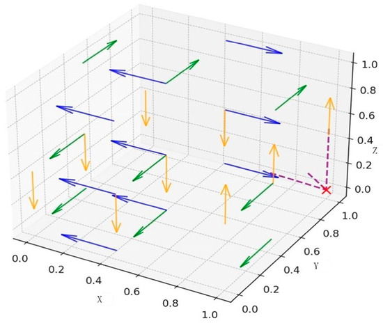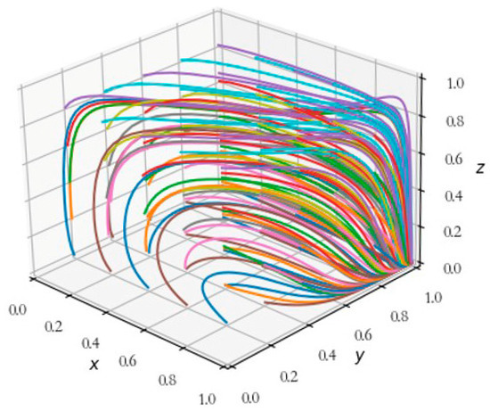 According to the application of Lyapunov’s indirect method [68], an equilibrium point is considered asymptotically stable if all the eigenvalues of the Jacobian matrix have negative real parts; this implies that the corresponding strategic configuration constitutes an evolutionarily stable strategy (ESS). If at least one eigenvalue has a positive real part, the corresponding equilibrium point is unstable and cannot be classified as an ESS. If the eigenvalues include both negative and zero real parts, the point is considered a saddle or critical point and its local stability cannot be definitively determined via linear approximation alone. Accordingly, by substituting the eight equilibrium points into the Jacobian matrix, the corresponding eigenvalue signs, numerical values, and local stability conclusions were obtained. The results are presented in Table 3, from which it can be seen that the strategy combination at point E7 (1, 1, 0) constitutes an asymptotically stable equilibrium, indicating the existence of an ESS in the three-party evolutionary game. The corresponding phase diagram depicting the dynamic evolution around this point is illustrated in Figure 2.