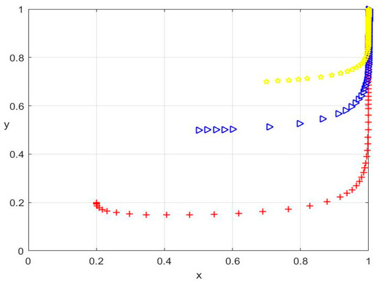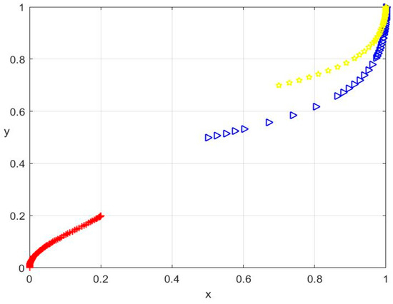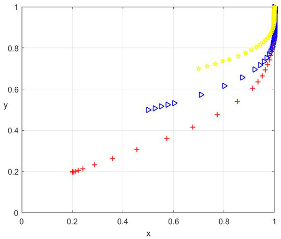In the proposed tripartite game model, setting all three replicator dynamic equations to zero—that is, —yields eight equilibrium points, corresponding to all possible combinations of pure strategy profiles among government, villager, and enterprise agents. To analyze the local stability of these equilibria, we constructed the Jacobian matrix based on the partial derivatives of each replicator dynamic function with respect to the strategic variables , , and :