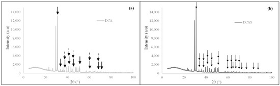 Considering that DCA typically contains around 21.6% Ca and 13.1% Mg [25], Table 2 shows that the Ca content in DCA exceeds the expected value. Moreover, all parameters measured in DCAS were higher than in DCA, notably 38.74% CaO and 99.92% NV.