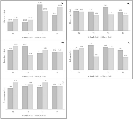 Figure 3c shows that the highest potassium content present in the grains was found mainly in those harvested in clay soil, in this case, those obtained in T1, T3, and T4, respectively. The levels were 10.23, 8.62, and 7.82 g/kg for these treatments. The more colloid, the higher the fertility since there is a greater nutrient storage capacity. Therefore, the clay fraction has the highest potassium content. In T2, a higher potassium content was detected in the grains obtained from sandy soil, reaching 10.10 g/kg of this nutrient. However, the potassium concentration referred to by Smith et al. [27] was 3.00 mg/g (equivalent to 3.00 g/kg), the levels obtained in the present study higher.