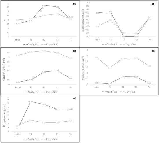 Regarding calcium content, Figure 4c shows that in sandy soil, the initial level of 0.24 cmolc/dm3 (classified as low) increased to 0.52, 1.37, 1.50, and 0.68 cmolc/dm3 in T1, T2, T3, and T4, respectively. Nonetheless, considering these values, calcium levels are still classified as low [18]. The same figure shows that in clayey soil, the initial calcium level (classified as medium) increased in T1, T2, and T3, with values of 3.59, 3.72, and 3.49 cmolc/dm3, respectively. These calcium levels are classified as medium [18,29]. As a corrective agent that reacts slowly in the soil, DCA provides a prolonged residual effect [25].