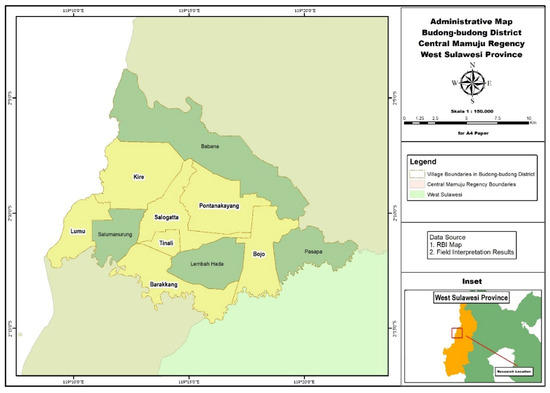 This research employs a quantitative descriptive approach to analyze variations in asset ownership, strategies, and livelihood outcomes among three typologies of oil palm smallholders in the Central Mamuju Regency [19]. The research location was selected through purposive sampling in Budong-Budong District, Central Mamuju Regency, West Sulawesi Province, encompassing seven villages: Salugatta, Tinali, and Pontanakayyang (representing ex-PIR transmigrant smallholders); Kire, Lumu, and Barakkang (representing independent smallholders); and Bojo Village (representing plasma smallholders) (Figure 1).
