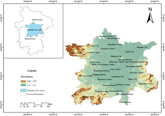 The Dongting Lake region (Figure 1), situated in central-south China [18], spans the geographical coordinates of 110°40′–113°10′ E and 28°30′–30°20′ N. The area experiences an annual average temperature range of 15.6–17.7 °C and receives an annual precipitation of 1200–2000 mm. The study area encompasses the surrounding regions of Dongting Lake, including Changde City, Yueyang City, and Yiyang City in Hunan Province; Wangcheng District and Yuelu District of Changsha City in Hunan Province; Honghu City in Hubei Province. Characterized by relatively flat topography and fertile red soils conducive to plant growth, the lake region represents a major agricultural production area, with forest land covering approximately 30% of the total area. As China’s second largest freshwater lake (mean water surface area: 2820 km2), it constitutes a pivotal zone supporting Yangtze River’s watershed ecosystem recovery and species conservation [19].