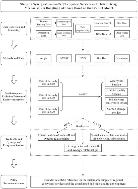 After preliminary data processing using ArcGIS 10.8 software, this research first utilizes the InVEST model [20] to conduct spatial quantification analysis of four critical ecosystem services (ESs) in the research region: SR, WY, HQ, and CS. Subsequently, SPSS 28 software [9] is used to perform pairwise correlation analysis to identify these services’ trade-off/synergy relationships, while GeoDA 1.22 software [21] is applied to investigate their spatial distribution patterns. Finally, the geographical detector [14] method is utilized to ascertain the driving factors behind these trade-off/synergy relationships. The technical workflow is illustrated in Figure 2 below.