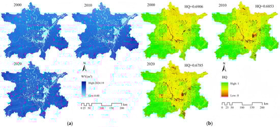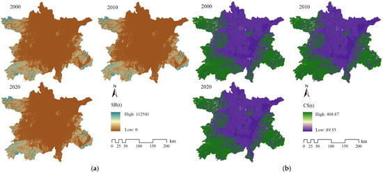 Based on the InVEST model modules (WY, SR, HQ, and CS), the total value of ESs in the study area was calculated (Table 6). Spatiotemporal distribution maps of each service were generated through analysis (Figure 3 and Figure 4).