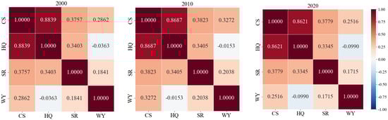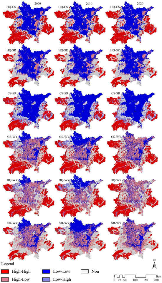 During the period of 2000–2020, the study area showed positive correlations between CS-WY, SR-WY, CS-HQ, CS-SR, and SR-HQ, indicating synergistic relationships among these ESs. A negative correlation was observed between HQ and WY, showing trade-off patterns.