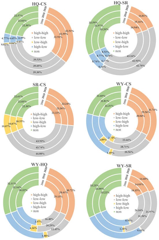 Specifically, during 2000–2020, the synergistic areas between HQ and CS accounted for approximately 72.45%, 71.65%, and 71.81% of the total area, respectively, showing an overall descending tendency with progressive diminution magnitude of about 0.88%. Conversely, their trade-off areas represented merely 5.25%, 5.51%, and 5.60%, respectively, demonstrating an increasing trend with a growth rate of approximately 6.66%.