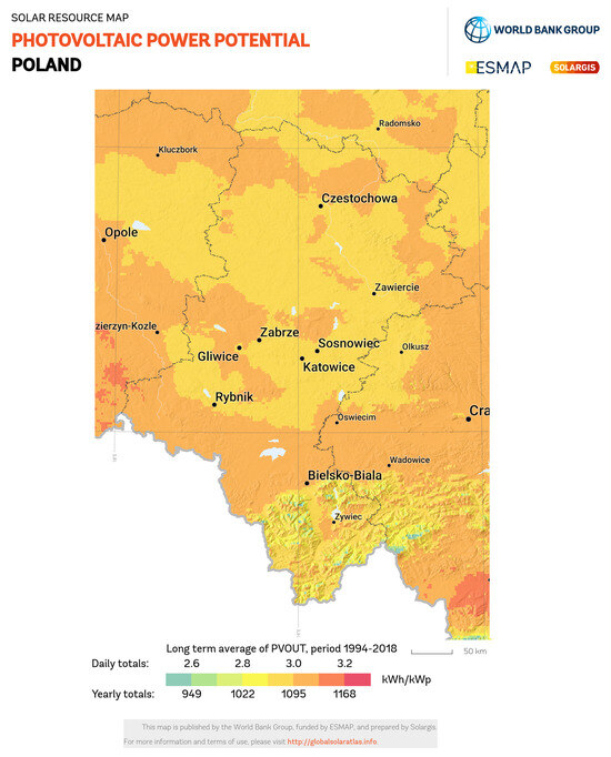 Solar electricity potential for the Silesia Region, according to SOLARGIS data [16].