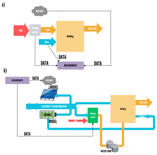 The assessment of cooperation of the renewable sources of heat and renewable sources of power needs to be calculated in a manner accounting for instantaneous imbalances. In other words, the calculation needs to be performed with a dense time resolution, and as such, it is desirable to have a database of frequent measurements. A complex building energy monitoring system had to, therefore, be constructed. Such systems are currently mostly of interest in the field of “smart-buildings”, “the Internet of Things”, and general process automation such as in the works of Stavropoulos et al., Peng et al., and Wei et al. [10,11,12]. Implementations vary, with some authors showing the viability of low-cost solutions, such as in the study by Khwanrit et al. [13]. The use of building energy monitoring data for component modeling has also been proposed by some authors, for example, Manfren et al. [14], who used digital twins to model heat pumps and radiator valves.