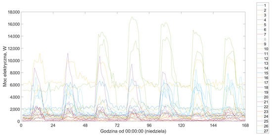 where instantaneous power, N, is expressed in kilowatts and the indices refers to the following: network—network; gen—local generation from RES; hp—heat pump; us—energy consumption for utility purposes; and ac—energy consumption for air conditioning purposes. The power drawn from the network is the output value. The generation from RES sources depends on the adopted technology and is calculated using meteorological data and data from the PVGIS [17] system.