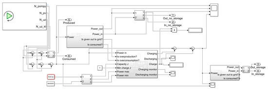 Energy storage calculations were performed with a high degree of abstraction. A dynamic energy storage model was constructed in ’Simulink’, using the yearly profiles of energy consumption and the production for a modernized building as its input data. The maximum storage capacity, maximum charge, and discharge power are assumed as model parameters. The model does not take the battery type or its electrical parameters into consideration. The output data are the yearly values of energy consumed and sold to the grid. The system is illustrated in Figure 7. As can be seen, the model only utilizes the instantaneous values of electrical power and its integrals—energy—and as such can be considered to be highly simplified.