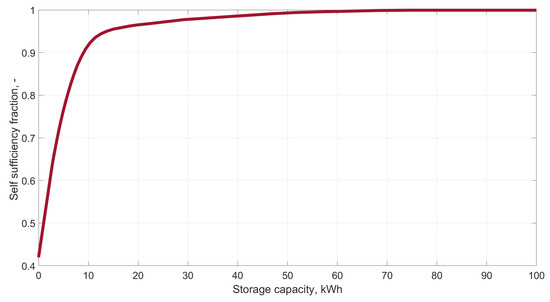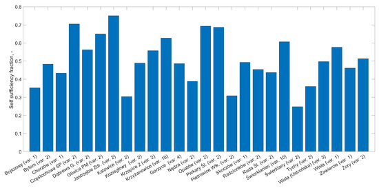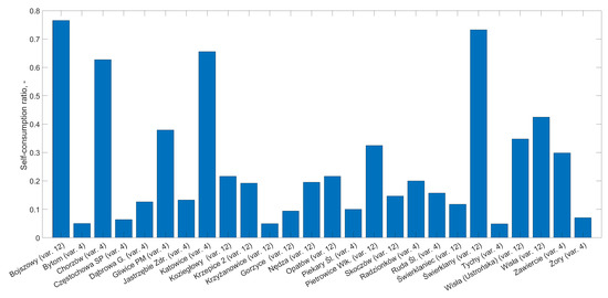 Note, however, that the data shown consider only the best variants as far as electrical self-sufficiency is concerned. Thus, the high values are arrived at by the virtue of the building either having a district heating connection or the implementation of biomass boilers. Thus, it is also of interest to present results compiled only for variants 9–16 and without the buildings with a district heating system connection. Such results are displayed in Table 9. The values are now lower, however, still substantial. Of the 15 buildings considered in Table 9, 8 can reach over 50% self-sufficiency with a storage capacity of 20 kWh. With 50 kWh, three buildings are over 80% self-sufficient. What is of interest, is that this amounts to the smaller buildings (Krzyżanowice, Gliwice, Świerklaniec), though no overall trend is found in this regard.