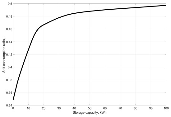Effect of storage capacity on self-consumption for an example building (Wisła, var. 12).