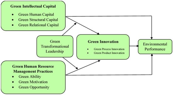 While research on intellectual capital (IC) at the firm level has been extensive, particularly in studies such as those conducted by [3], the existing literature often overlooks the incorporation of environmental strategies into IC, thus failing to elucidate how GIC influences firm performance as noted by [16]. Conversely, investigations into GHRM have primarily focused on conceptual frameworks and theoretical foundations, leaving a gap in empirical research regarding its direct impact on environmental performance within organizational settings [17]. Although some studies have explored the relationship between specific GHRM practices and environmental outcomes, a comprehensive understanding of the nuanced interactions between GHRM strategies and overall environmental performance metrics still needs to be discovered. Consequently, questions persist regarding the role of environmental issues and mediating effects. Agostini et al. [4] underscore the need to explore how GIC and GHRM influence environmental performance. To address this knowledge gap and advance our understanding, this paper examines whether green innovation mediates the relationship between GIC, GHRM, and environmental performance. An important aspect is that the management’s leadership quality is essential to implementing the GIC, GHRM, and green innovation. To address the importance of leadership, this study examines the moderating role of green transformational leadership between GIC, GHRM, and green innovation.