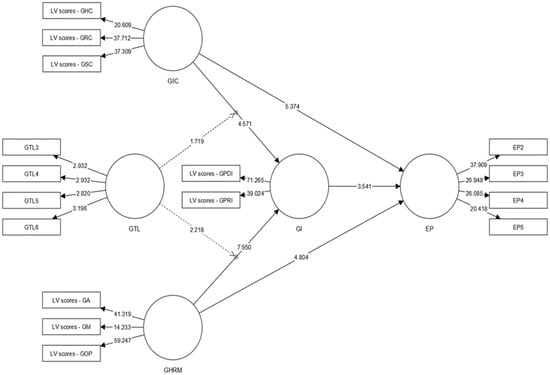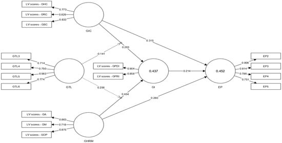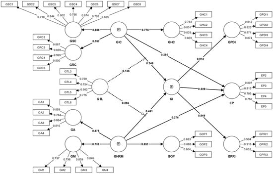 The measurement model was examined to construct second-order variables, specifically GIC, GHRM, and GI. GIC integrates three dimensions: green human capital, green structural capital, and green relational capital. GHRM consists of components reflecting green ability, motivation, and opportunity, while GI includes green product and process innovation. Given the inclusion of second-order constructs in our model, we employed the disjoint two-stage approach in PLS-SEM for higher-order construct analysis, following the guidelines of Hair et al. (2019) [61]. In the first stage, we obtained the latent variable scores of the first-order constructs, which were then used as manifest indicators for their respective second-order constructs in the second stage. This approach is appropriate for reflective–reflective hierarchical component models and ensures conceptual clarity while providing consistent and unbiased estimates [40]. The disjoint two-stage approach also allows for efficient handling of complex models, aligns with the theoretical structure of our constructs, and facilitates straightforward interpretation of higher-order relationships within the structural model.