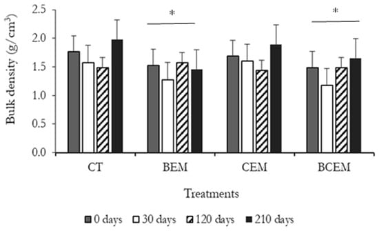 Change in the bulk density of the soil under the different treatments, before (0 days) and 30, 120, and 210 days after the application of organic amendments. CT: control, BEM: biochar + effective microorganisms, CEM: compost + effective microorganisms, BEM: biochar + compost + effective microorganisms. *: treatments that show significant differences, considering all temporal evaluations of bulk density.