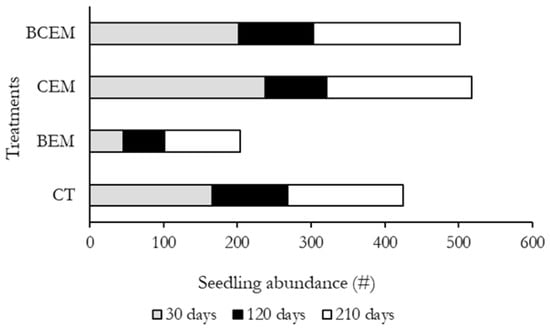 The evaluation of seedling abundance indicated that the BEM treatment did not promote the establishment of seedlings; in fact, it led to a reduction compared to the control group (Figure 2). Conversely, the CEM treatment clearly supports the establishment of seedlings, with a greater abundance observed at 210 days in both the CEM and BCEM treatments. Notably, seedling abundance in the CEM treatment was 2.5% higher than in the BCEM treatment. The increase in seedling abundance related to CT with the application of CEM and BCEM was 21.6% and 18.1% higher, respectively. Furthermore, the impact of the treatments on seedling abundance became substantially evident after a period of 30 days (Figure 2).