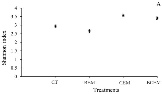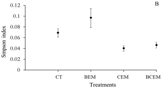Shannon (A) and Simpson (B) diversity index and 95% confidence intervals for seedling morphotypes under the different treatments, at the end of the experiment (210 days after their application). CT: control, BEM: biochar + effective microorganisms, CEM: compost + effective microorganisms, BCEM: biochar + compost + effective microorganisms.