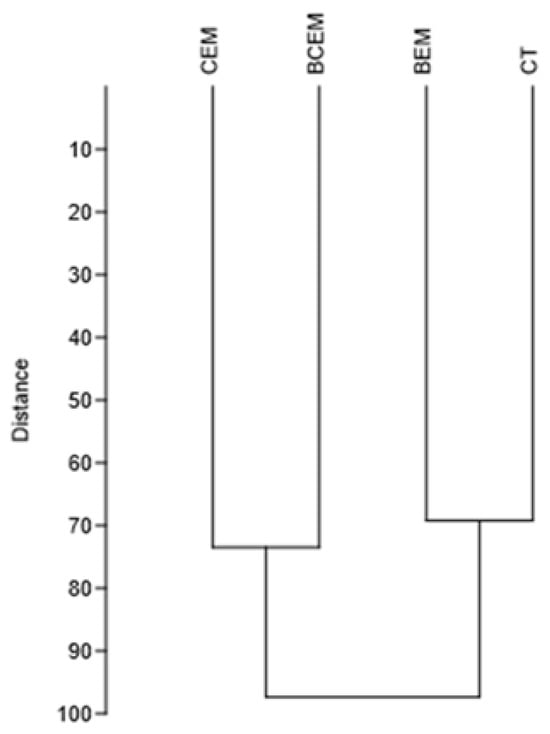 The results indicated a high similarity for seedling morphotypes between the treatments, approximately 70%. Two distinct groups of treatments were identified (Figure 4), CEM and BCEM, which exhibited significant similarities to one another (73%). In contrast, the BEM treatment was more similar to CT (69%). It is to be remarked on that 37.5% of morphotypes were common across all the treatments, while 25% were exclusive to a single treatment.