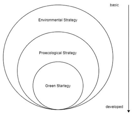 This alignment positions Dubai South not only as a local success story but also as a key contributor to the UAE’s Nationally Determined Contributions (NDCs) and global net-zero commitments. Another study, ref. [20] categorizes strategies into three tiers: Environmental Strategy, Proecological Strategy, and Green Strategy, with each level demonstrating an increasing degree of environmental commitment and complexity (Figure 1).