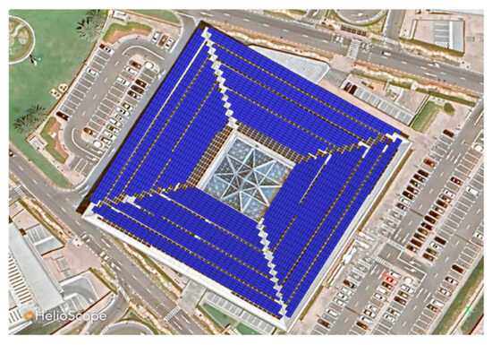 The results from Helioscope provided a starting point for refining the PV system layout before moving on to detailed energy yield simulations in PVsyst. Figure 4 visually represents this assessment, illustrating how the available space was mapped and factored into the system design. Once the initial feasibility was established, PVsyst was used to simulate the system’s energy output), as shown in Figure 5. PVsyst was chosen for its detailed analytical capabilities, allowing the integration of key factors, such as irradiance, shading, temperature effects, and module performance, to provide accurate energy yield estimates.