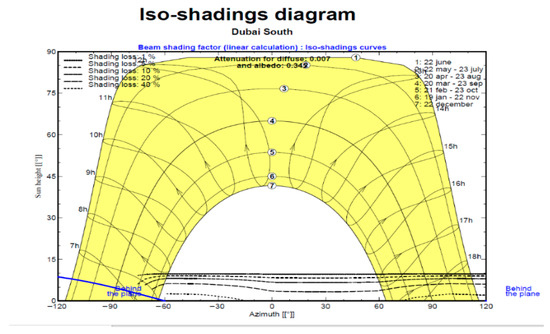 The simulation results helped fine-tune the design, optimize component selection, and ensure economic feasibility, aligning the project with DEWA’s guidelines while enhancing overall performance. Additionally, full shading analysis was performed in parallel to further accurately estimate the generation. Figure 6 showcases the sun path diagram with the shading analysis of the proposed system. The Iso-shading diagram provides a year-round representation of the sun’s trajectory and potential shading.