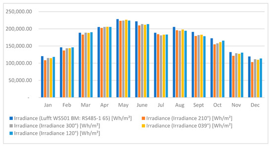 The irradiance profile for 2022, Figure 7, reveals a consistent seasonal pattern, with peak values recorded during the summer months, particularly from May to August. A slight but unexpected drop in July’s irradiance is attributed to several days of summer rainfall. In contrast, the lowest irradiance levels occurred during the winter months, November through February, due to reduced solar altitude. Directional sensor data further illustrates how the sun’s angle and position affect irradiance distribution. Notably, the Lufft WS501 BM: RS485-165 sensor, positioned at the center, recorded the highest irradiance throughout the year, highlighting the advantages of unobstructed central placement. Conversely, sensors oriented at 039° and 120° recorded the lowest values during winter, reflecting the impact of lower solar angles in the Northern hemisphere.