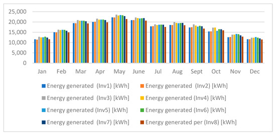 An inverter is also a component of the solar PV system. The system employs multiple inverters distributed across the PV array, enabling detailed performance tracking. Inverter-level monitoring over 12 months revealed clear seasonal patterns and inter-inverter variability. As shown in Figure 8, energy output was highest between March and May. Inverters Inv3 and Inv5 consistently outperformed others, while Inv4 and Inv6 exhibited moderate output. A downward trend toward the end of the year reflects shorter daylight hours and reduced irradiance. These data support targeted maintenance, inverter selection for future projects, and design modifications to ensure load balancing across system strings.