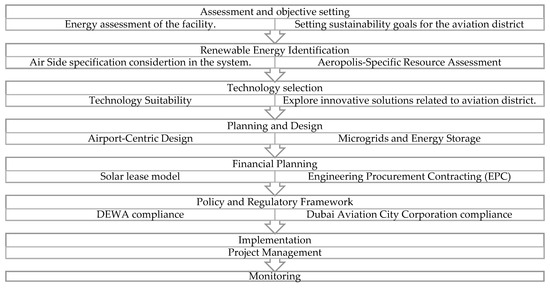 The roadmap for the Aviation District, illustrated in Figure 15, begins with a comprehensive energy audit tailored to the district’s operational criticality and regulatory complexity. Integration planning prioritizes compatibility with existing airport infrastructure and strict adherence to aviation safety protocols, including compliance with the Dubai Aviation City Corporation and DEWA. Due to the district’s high reliability and power quality requirements, the strategy emphasizes smart grid integration, real-time monitoring systems, and fault-tolerant system design. The solar lease model is preferred to expedite deployment while preserving liquidity for aviation operations. Implementation is carefully scheduled to minimize disruption to flight operations and ground services, reflecting the mission-critical nature of aviation activities.