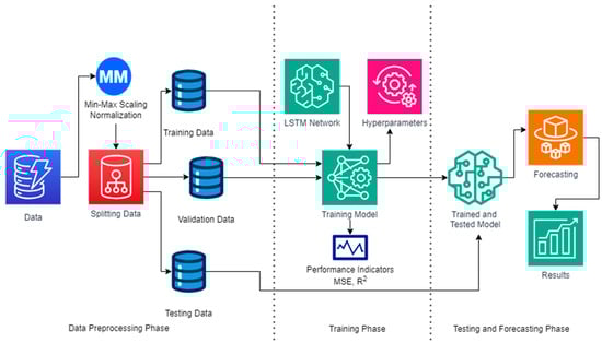 Data preprocessing phase: This phase involves normalizing the data using the Min–Max Scaling technique, which converts the data into the interval [0,1]. This method is used to maintain numerical stability and enhance convergence. To preserve the temporal structure of the time series, the dataset was chronologically split into 80% training, 10% validation, and 10% testing, without scalability.