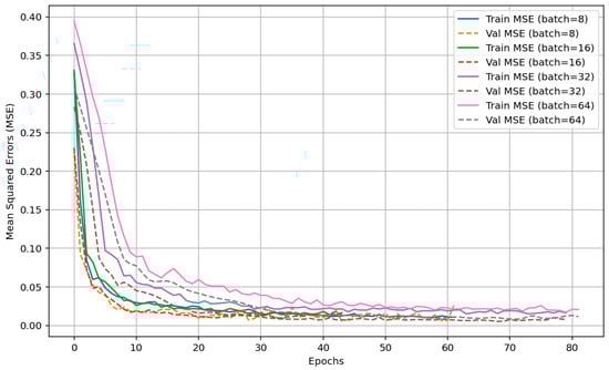 To improve model performance and prevent overfitting, a systematic model tuning process was implemented. Several configurations were tested, varying the number of LSTM units (50 or 100 in the first layer, and 25 or 50 in the second), the number of training epochs (50 or 100), and batch sizes (8, 16, 32, and 64), while maintaining a fixed dropout rate of 0.2 and the Adam optimizer with a learning rate of 0.001. The best-performing architecture was selected based on model performance metrics calculated using the validation set. Performance was evaluated using the Mean Squared Error (MSE) and the coefficient of determination (R2). If the MSE indicator is equal, the R2 indicator is compared, and the model with the closest value to 1 is selected. Additionally, an early stopping mechanism based on validation loss with a patience of 10 epochs was applied. The best results for each batch are shown in Table 3.