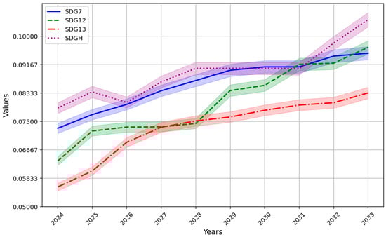 This graph was generated using the proposed model, which is likely based on a trend forecasting approach for the SDGs between 2024 and 2033. The model analyzed historical data to predict future trends in SDGH related to SDG7, SDG12, and SDG13. The higher values suggest an expected improvement in SDGH, with variations reflecting the uncertainty of the forecast. The shaded areas around the curves represent confidence intervals, indicating the reliability of the predictions. Some fluctuations, especially around 2028 and 2031, may result from economic or political events simulated by the model. SDGH follows an upward trajectory, suggesting general progress toward sustainable development in the Ha’il region. SDG7 and SDG12 gradually converge towards SDGH, indicating that clean energy and responsible consumption make positive contributions to sustainability goals. However, SDG13 consistently lags, highlighting a potential delay in climate action that may hinder the full implementation of SDGH. The sequential nature of the RNN enables it to capture long-term trends; however, the reliability of these forecasts depends on the policies implemented by the authorities. A deeper analysis of the factors that affect SDG13 may be necessary to enhance its alignment with SDGH and ensure complete development in Ha’il.