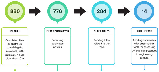 Finally, a detailed review of the selected articles was conducted. During this stage, articles addressing topics related to the assessment of competencies in contexts outside engineering education, general curriculum development, or teaching methodologies not directly involving the measurement or evaluation of technical and soft skills in engineering programmes were excluded. After applying these criteria, 14 relevant articles were identified and retained for further analysis in this research.