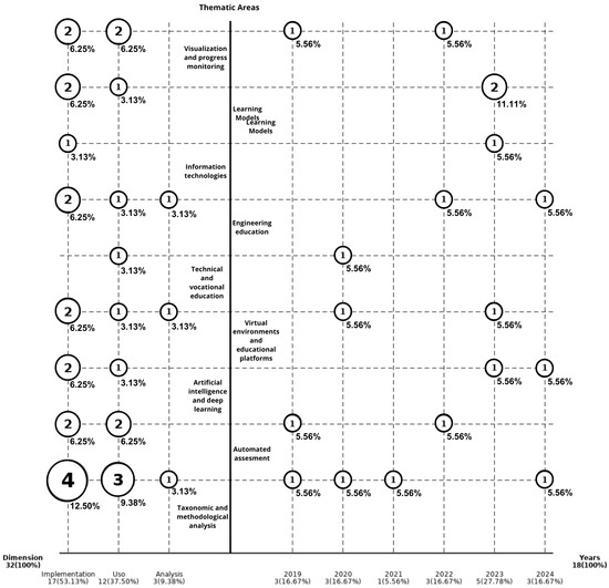 As previously explained, the classification framework allows for multi-categorisation, whereby a single article may be assigned to more than one type of contribution, for example, combining an analytical review with a practical implementation or use case. This methodological decision enables a more nuanced representation of the literature and helps capture the complexity of contributions in the field of engineering education. According to this framework, the quadrant on the left of the figure illustrates the distribution of articles by type of contribution and thematic area. The classification reveals that most articles are concentrated in the Implementation category, with 17 instances. The Use category is the second most represented, with twelve instances, while the Analysis category includes only three articles.