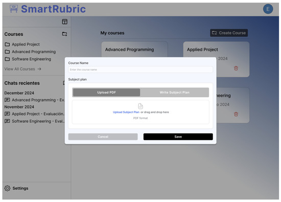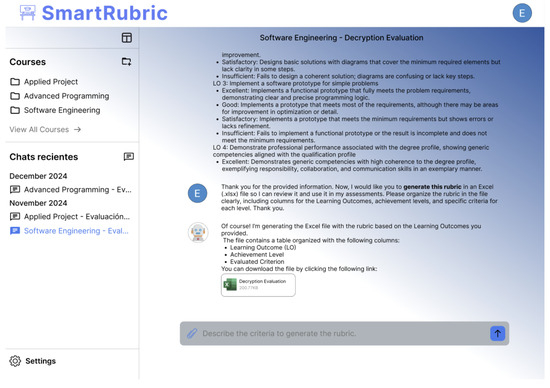Figure 9 shows the artificial intelligence chat interface, designed to assist users in the creation and improvement of assessment rubrics. This tool not only allows for recommendations and adjustments to the assessment criteria, but also automatically generates an Excel file with the rubric structured according to the subject. This functionality facilitates the export, editing and direct application of the instrument in educational contexts, optimising the teaching work and promoting a more coherent and efficient evaluation.