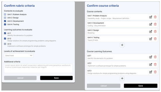 Finally, in Figure 10, the selection of learning outcomes and competence areas screen is displayed, the system allows the user to choose, from among the previously entered or extracted learning outcomes, the ones that will be assessed in the rubric. In addition, it offers an interface to select the associated generic and specific competence areas that will serve as the basis for generating the assessment criteria. This functionality is key to ensure that the rubrics created are aligned not only with the course objectives but also with the competency frameworks defined by the institution or professional standards. The interface is organised in sections that allow each learning outcome to be visualised and linked to the relevant evaluative dimensions, thus favouring a comprehensive and competency-focused assessment.