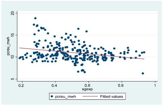 Table 2 presents an overview of the descriptive statistics for all variables included in the analysis. Ahead of regression, it is prudent to assess the interplay between variables and the variance inflation factor (VIF) for each regressor, which has been duly computed. Table 3 illustrates the pairwise correlation coefficients, accompanied by their corresponding significance levels in parentheses. In terms of VIF, the computed values span from 1.22 to 3.32, indicating that the issue of multicollinearity among the regressors is not a prominent concern. The detailed VIF outcomes are accessible upon request. Notably, the policy dummy (PD) and the share of government expenditure on environmental protection (sgexp) are pivotal variables in this study, warranting a closer examination of their relationships with per capita government expenditure (pcgexp). The pairwise correlation analysis reveals a noteworthy negative association between these two key variables and per capita government expenditure (as presented in Table 3). This negative trend is further depicted in Figure 1, illustrating the inverse relationship between pcreu and sgexp. An insightful comparison is presented in Table 4, showcasing the divergence in pcreu with and without explicit environmental policies. Within periods and provinces characterized by explicit environmental policies, the mean per capita residential energy consumption was notably lower at 9.64 mwh, in contrast to 10.71 mwh in instances where there were no explicit environmental policies.