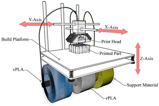 Both vPLA and rPLA were sourced from Ultimaker. Filament diameter, nominally 2.85 mm, was confirmed using a calibrated digital calliper (±0.02 mm). Multi-material specimens were fabricated using an Ultimaker S5 3D printer. The printer underwent calibration, including bed levelling, extruder alignment, and filament diameter verification, with all calibration logs recorded to ensure reproducibility. The printing environment was maintained at 22 ± 1 °C and 45 ± 5% relative humidity to reduce environmental variability. Figure 1 provides a schematic diagram of the FDM process.