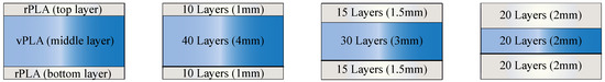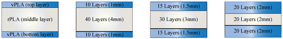 Variations in MMAM configurations are summarised in Table 5. These configurations vary both the material ratio and the stacking sequence to isolate their individual and combined effects as shown in Figure 3 (vPLA: rPLA) and Figure 4 (rPLA: vPLA).