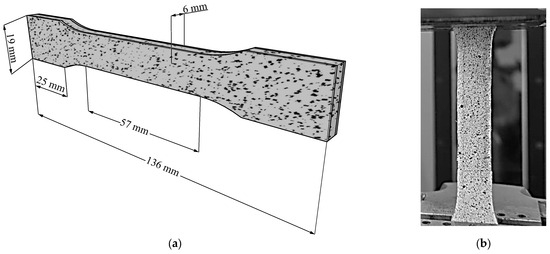(a) 3D-DIC tensile sample dimensions and (b) fabricated sample with high-contrast speckled pattern.