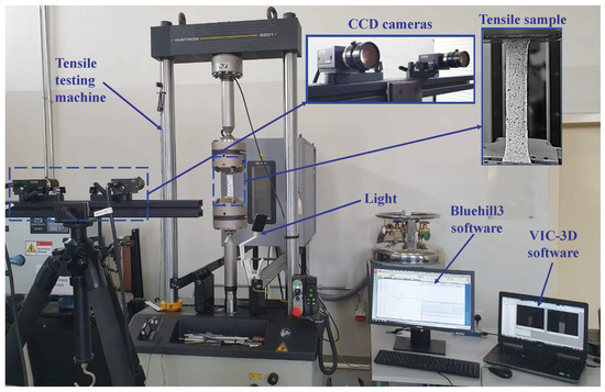 Two high-resolution charge-coupled device (CCD) cameras were arranged in a stereoscopic configuration and calibrated for 3D strain measurement (Figure 6). The stereo-vision system allowed reconstruction of surface geometry, enabling detailed mapping of localised strain evolution during incremental loading. Specimens were incrementally loaded using a universal testing machine at a consistent crosshead speed of 5 mm/min, with image acquisition synchronised at defined load increments for high-resolution capture of deformation events from initial loading through final fracture.