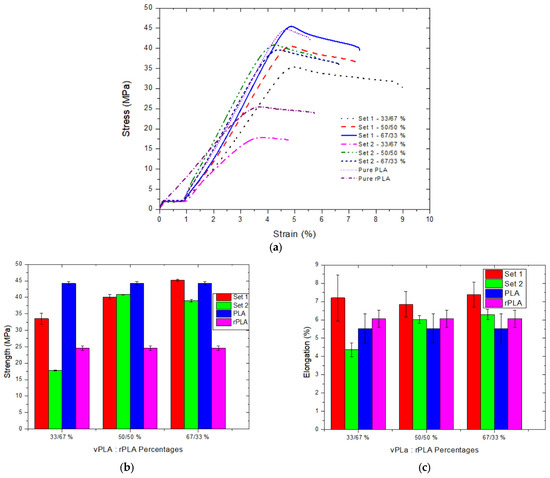 (a) Stress–strain curves, (b) tensile strength, and (c) elongation for MMAM samples. The 100% vPLA and 100% rPLA samples are included as baseline references for comparison against the mixed-ratio specimens.