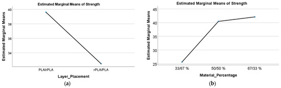The tensile test data were analysed, and an ANOVA was performed using IBM SPSS Statistics 29.0 to assess the significance of Layer Placement and Material Percentage on key mechanical properties, including tensile strength, modulus, and elongation at break. A significance threshold of p < 0.05 was applied to determine statistical relevance, and partial eta squared values were calculated to quantify effect sizes. The estimated marginal means were derived from the two-way ANOVA and reflect adjusted group means that account for other factors in the model, enhancing comparability across groups. The model included interaction terms to explore whether the influence of material composition varied based on layer arrangement.
