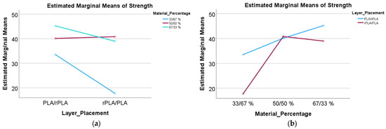 Moreover, the interaction plots in Figure 9a,b illustrate the relationship between layer placement and material ratio. In Figure 9a, the interaction effect shows that the improvement in tensile strength associated with using vPLA as the outer layer is most pronounced at higher vPLA ratios. Figure 9b reinforces this observation by demonstrating that the effect of material ratio on tensile strength is strongly dependent on the stacking sequence. The crossing of the interaction lines confirms that these parameters do not act independently.